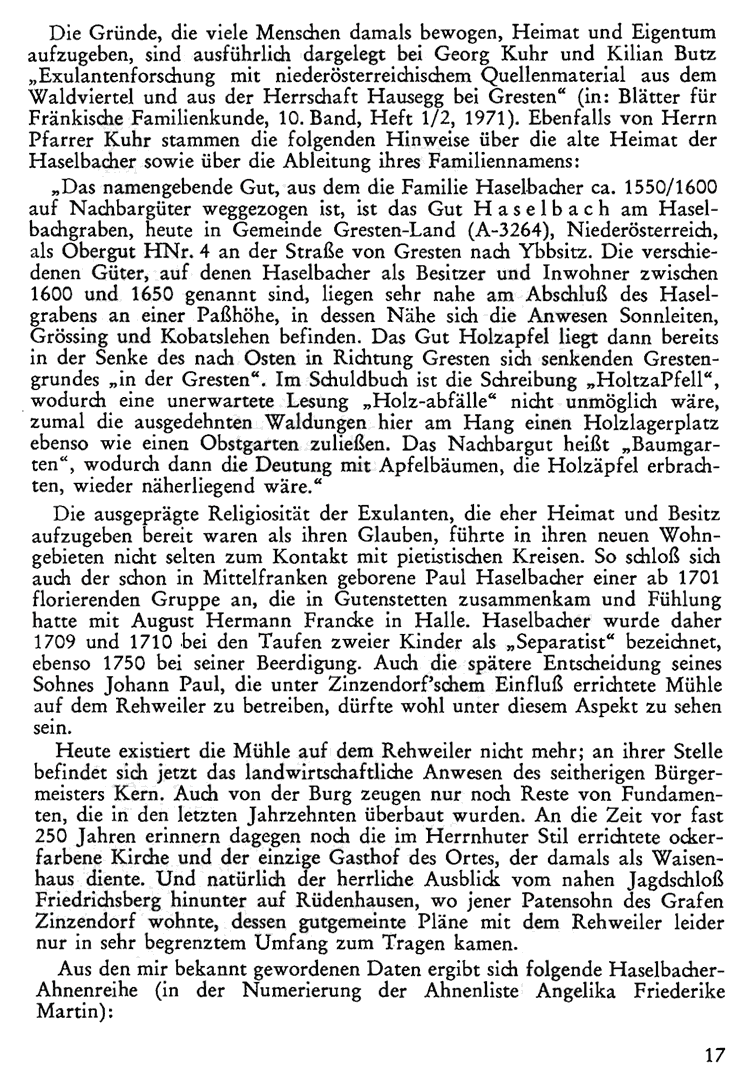 The reasons that caused many people to move their home and possessions (from Austria) were laid out in detail by Georg Kuhr and Kilian Butz (Reference in text). Likewise from Herr Pfarrer Kuhr comes the following information about the old Hasselbacher homeland as well about the derivation of the family name.
