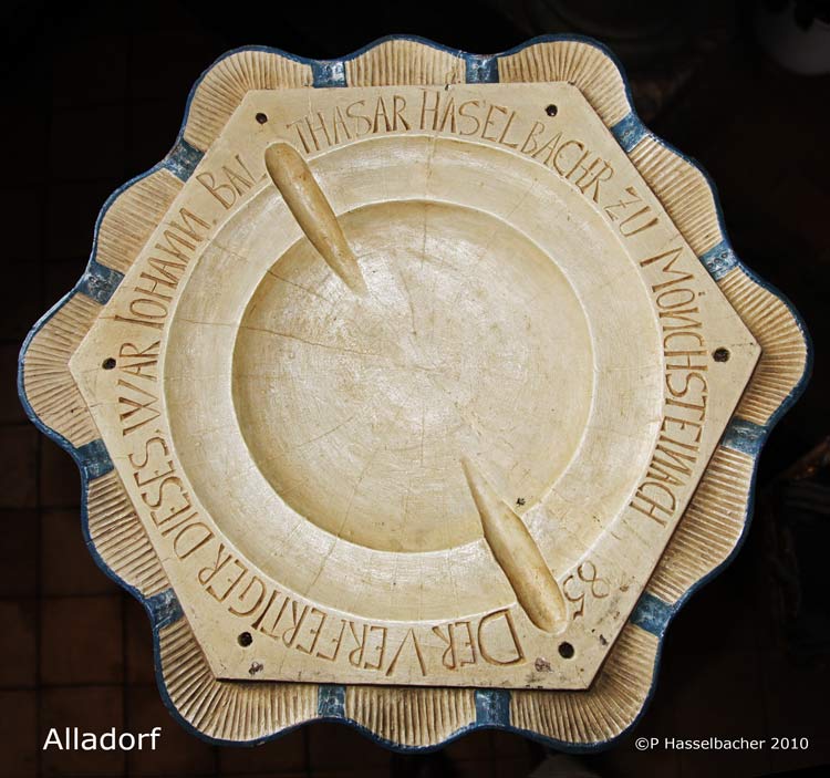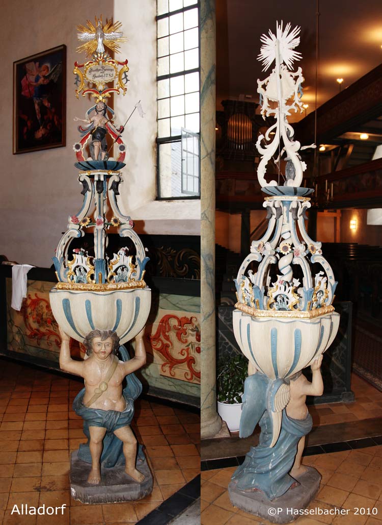 Pfarrer Bacigalupo and I drove through a beautiful part of Franconia to the village of Alladorf where the caretakers of the church opened its doors for us. The black-and-white image previously available left me totally unprepared for the highly decorated and colorful font we found. It is clear that Balthasar found his inspiration from the Taufbecken in his hometown, right down to the belt and wings. This is an object from the hands of a Hasselbacher of over 200 years ago. The direct connection had even more impact when I saw what lay beneath the cover.