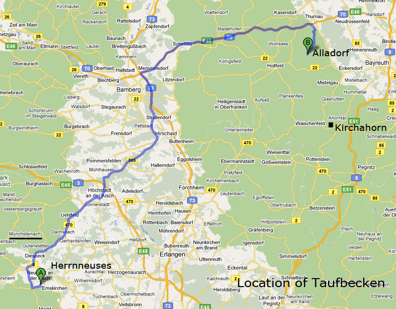 A Google map of my trip from Oberrossbach to Alladorf and back to Herrnneuses for my quest of Taufbecken (baptismal fonts). In each of these four places is a related Taufbecken in the style of the one in Münchsteinach shown below.