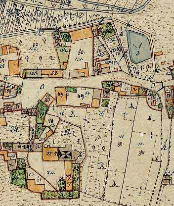By this time however, my German has improved enough to be able to make some sense of the text of the book and the legend of the map. A brown block appears to indicate an inhabited dwelling, and an orange one an uninhabited one. In this old map, what is today the site of house #55 contains a smaller outbuilding. House #55 is in brown and has no number within it. House #55 is to the right and immediately adjacent to House #56.
