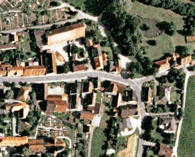 The next image is a screen shot of a Google Earth Image of Münchsteinach. You can identify the area of a pond. The church is seen in the lower left. The current location of House #55 is in approximately the center of the image (the adjacent red and dark roofs).