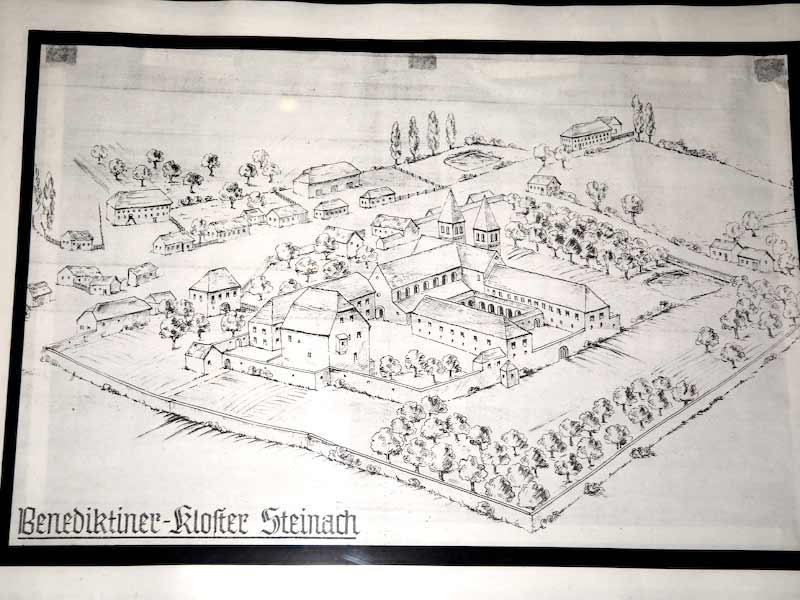 Below is a drawing or print that hangs in the Church of Münchsteinach. I do not know its age, but it must be a depiction well before the 1700s. The church and some of the monastery buildings remain today. Notice the pond in the upper center of the image along what is today Neustädter Straße. To the left of it are two small buildings and a barn. This is approximately the area of the "Hasselbacher estate."