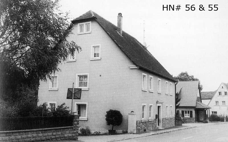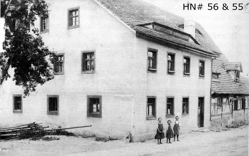 After the old Hasselbacher House burned down, it was rebuilt further to the east, and the neighboring House #56 was enlarged to include some of the area formerly occupied by House #55. It is suspected locally that the small garden adjacent to House #56 outlines the foundation of the old Hasselbacher House.