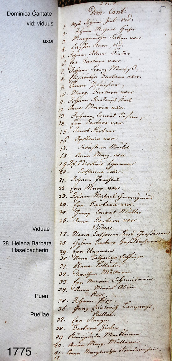 The remaining sections of names are Viduae (widows), Pueri (boys or young men) and Puellae (girls). I am willing to have my amateurish interpretation of Latin corrected. For example, although a dictionary will give the translation as “boys and girls,” I suspect that unmarried communicants of any age were included in these last two categories including an unmarried Balthasar Haselbacher who was 23 in later lists. Additional evidence supporting this conclusion is that all the names in the first sections are either widowers or pairs of married couples.