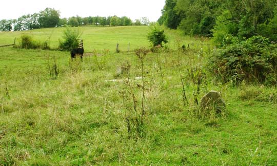 He wound up walking down the road to meet us, and I introduced myself, and what I was looking for. “Hazelbaker!” he exclaimed, “Some of your kin was looking for their grandpa or something last summer!” “Did they find him? Is this the old Sphar farm?” “Yep, this is the old Sphar place, but no, just the old graveyard, almost everything is down, and unreadable, they said they found D… something, but no Peter, wasn’t that your Grandpa’s name?” Yep, sure was. But, he was willing to let us have our own look. Going uphill further, south bound on that small Sphar Street, we came to the old barn mentioned in the account, on the right side of the road heading south. He told us the old Sphar farm house was behind where the barn stands, and all of that is gone. He said the graveyard was behind the barn and to the left, about 45 degrees bearing from the barn.