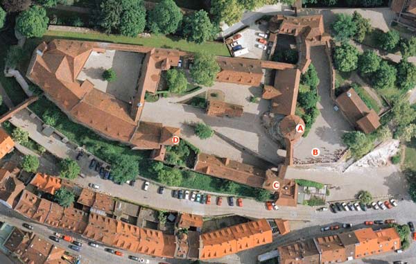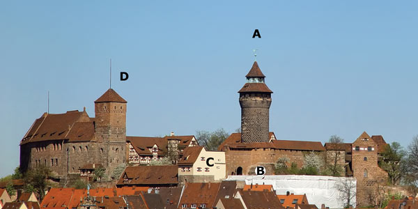 For those not familiar with the architecture of the Kaiserburg in Nürnberg, the following images should help. The first is a photo borrowed from the GermanWiki site, and the second a screen-shot from Google Earth. I labeled the four principal viewpoints discussed in the discussion pages of this section.