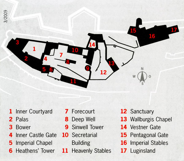 The Heathen's Tower is attached to the double chapel (upper and lower). It is called "Heathen" because of the presence of pagan and Renaissance decorations, most of which were apparently removed. The designation "Square" is my own. The Building C may be located above the old stables along the entrance to the Castle through the "Heavenly Gate." I do not know its history or function.