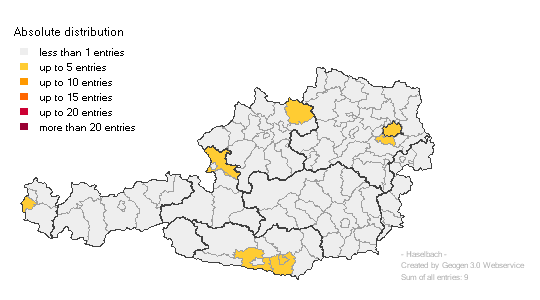 Below are Geomaps of the absolute counts of phone listings for the variants of Haselbacher and Haselbach in Austria taken from the Geogen website. Recall that there were no Hasselbachers or Hasselbachs in the Austrian phone book online.