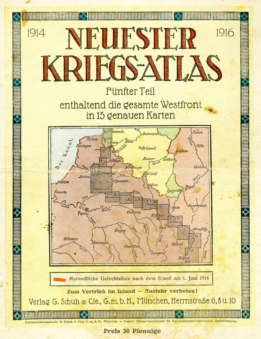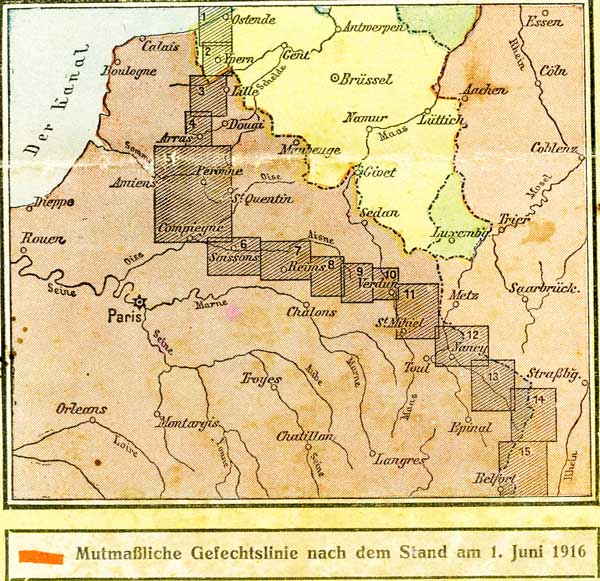 During my most recent trip to Germany, I was able, purely by accident, to acquire detailed maps of both the Western and Eastern fronts of WWI in Europe as of June 1916. These have already been of assistance as I reconstruct the path of Conrad's regiment. Because I believe they will be of interest to others, I duplicated them and present them here. I have little idea about what residual copyright protections may still be relevant. I give full credit to the original publisher and make these treasures available to other interested individuals. I will begin with the Western Front, and will present the Eastern Front later (sooner if someone tells me they have a specific interest)! If a higher resolution map is desired, please contact me and tell me of your interest, and I will try to accommodate your needs.
