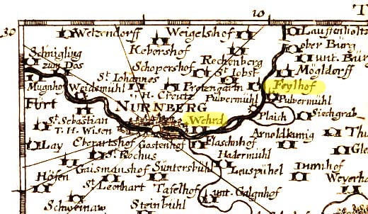 This was a divided property with the manor house at Oberveileilhof and, by at the time of the destructive Second Margrave War in 1552, a Pulvermuhle, or powder mill at the Unterveilhof upstream on the Pegnitz River. These kinds of mills pulverized materials into powders, including gunpowder! Perhaps that is why they tended to blow up! There were land disputes that I cannot follow, but around 1813-18, the Veilhof was annexed into the community of Rennweg. There were apparently some 7 primary and eight outbuildings with 60 inhabitants. In 1899 the land was annexed into Nürnberg.
