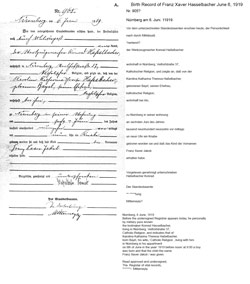 One of the first things I did after I began to search after my family roots was to try to find something about where my father was born. I remembered a story of my mother's about when she and my father returned to Nürnberg to live for a few years after his retirement. She was able to find a copy of his birth certificate, much to the surprise of my father who had apparently assumed that all his old records were lost forever. As he never had American naturalization papers of his own, it was a tangible connection to his past. This civil record was the first old German one I encountered. When I was finally able to translate that birth record, that I learned my father had been born at 37 Veilhofstrasse, in Wöhrd, a suburb of Nürnberg. I am eternally grateful to Frau Elvire Matheis of the Standesamt Nürnberg (vital records office) who opened the doors of my German heritage for me by later opening the books for me to many other old records of my Hasselbacher and Baÿerl families. At that time, the old German writing in the record was as so much hieroglyphics, but I could not help but to be awed in the presence of the original handwritten books containing the actual signatures of my grandfather and other relatives long-gone.