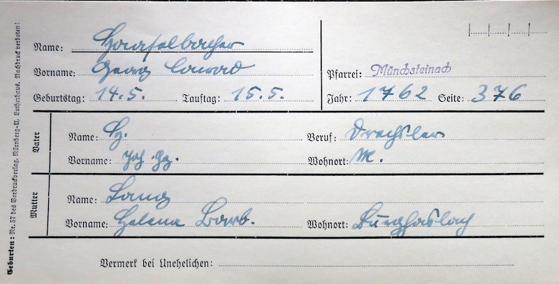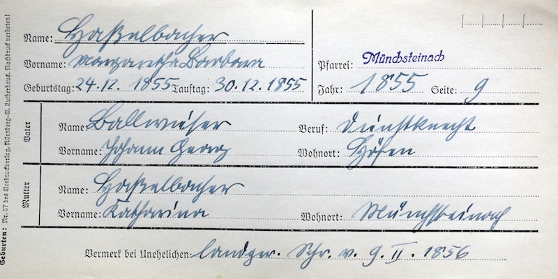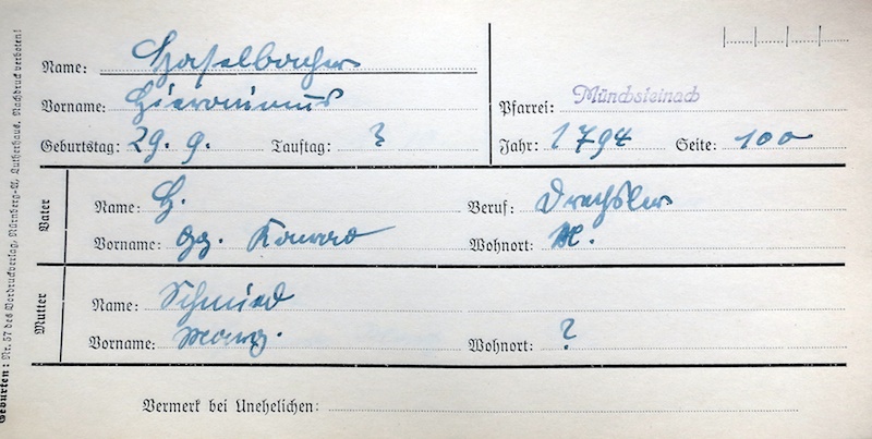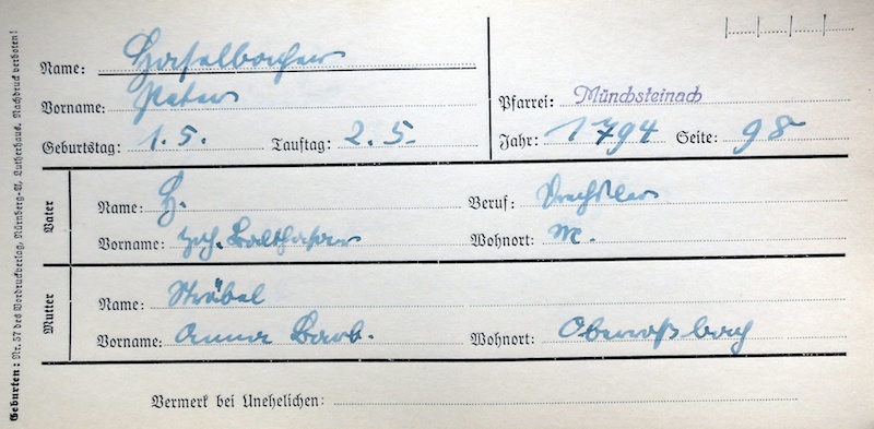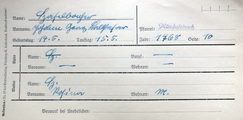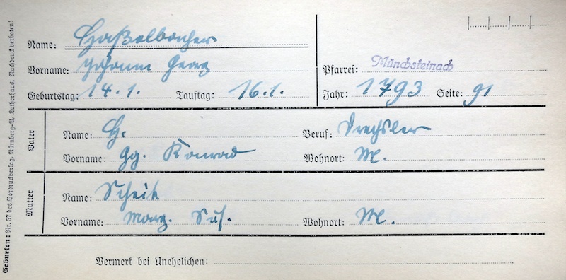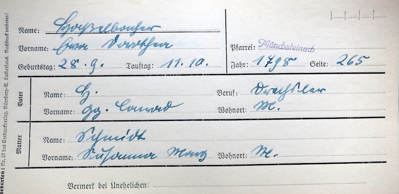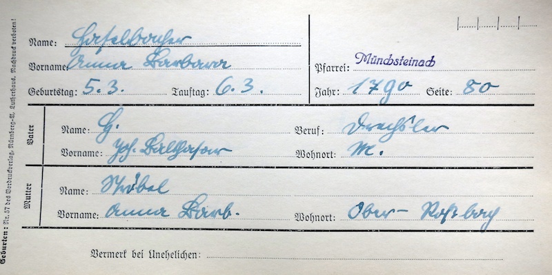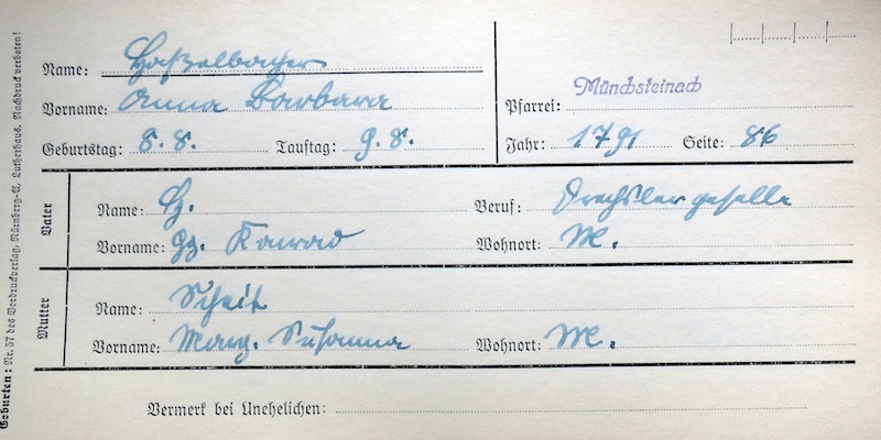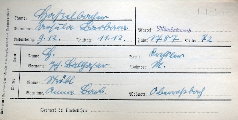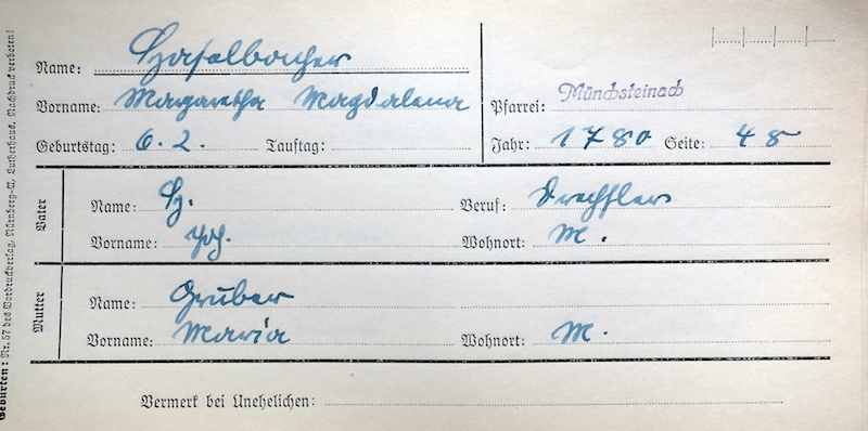 Thus the abstract immediately below is for Anna Barbara Haselbacher who was born March 3 and baptized March 6. (At a time when infant mortality was high, they didn't waste any time in protecting their children through baptism.) The year and page of the event was 1790 and page 80. The father is Johann Balthasar Haselbacher who is a Drechsler living in M[ünchsteinach] and the mother is Anna Barbara Ströbel from Ober-Roßbach.