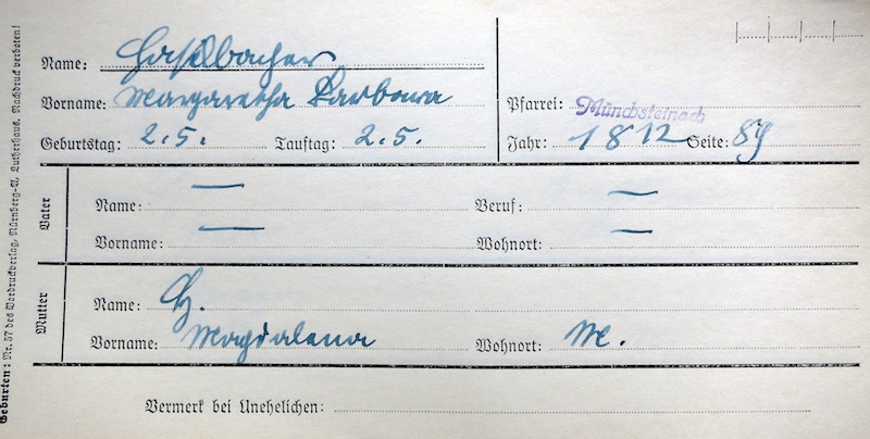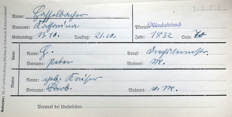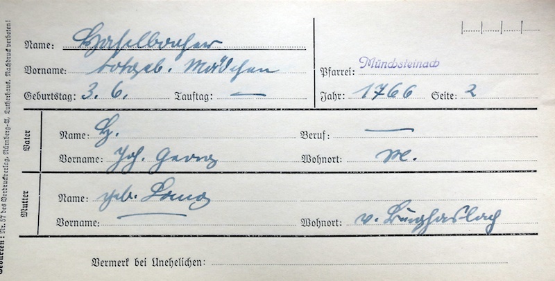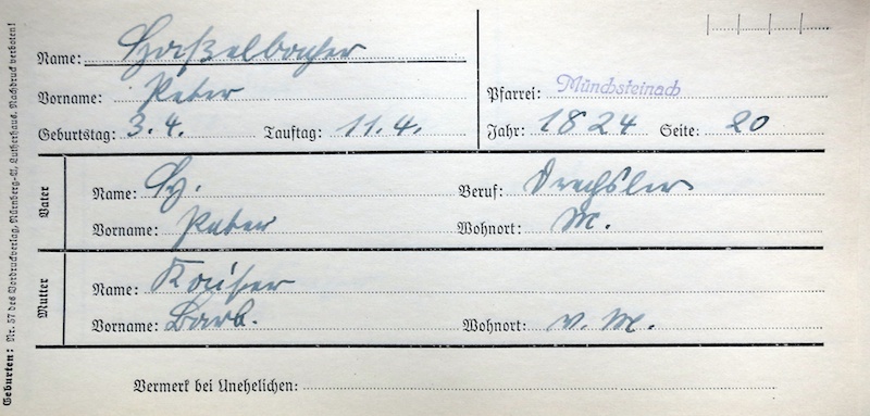 On the left are lines for Name for last and Vorname for first names. Below that are lines for Geburtstag or birthday and Tauftag or baptismal day. On the right is the Jahr or year of the event and the Seite or page in the churchbook on which the record is to be found. Below this material are the names of the Vater und Mutter or father and mother, the Beruf or occupation of the father, and, and Wohnort or place where they came from originally. The maiden name of the mother is given. The line at the bottom of the form is for remarks about illegitimacy. (Vermerk bei Unehelichen).