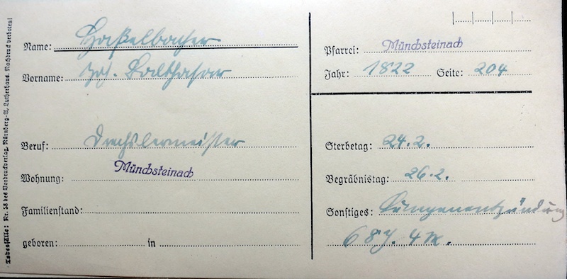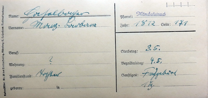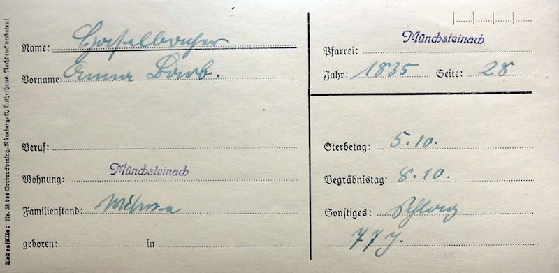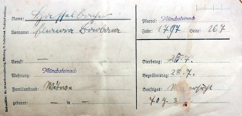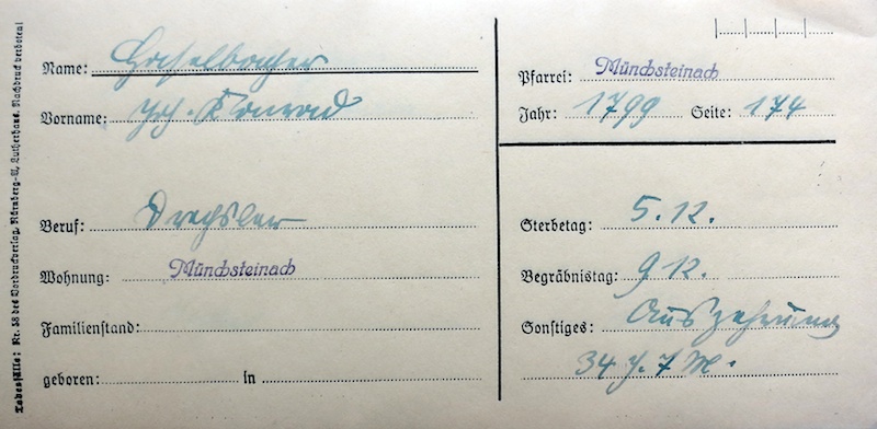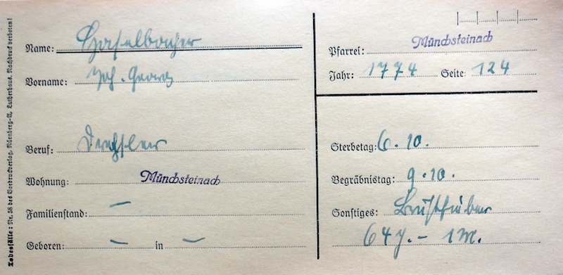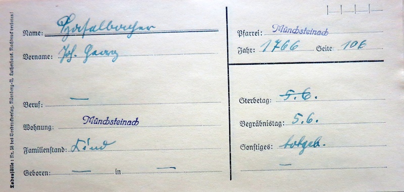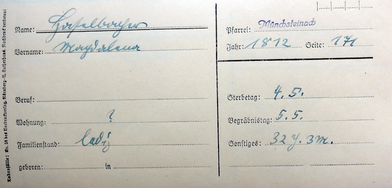 On the left are the Pfarrei or church, and the year (Jahr) and page (Seite) of the record. Below that are the days of death (Sterbtag) and burial (Begrabnistag), and Sonstiges or "other" and is used here mostly for cause of death. The last line is gives the age of the individual in years, months, weeks, and days. This is most helpful in paring a death with a birth record as the same given names are used frequently.