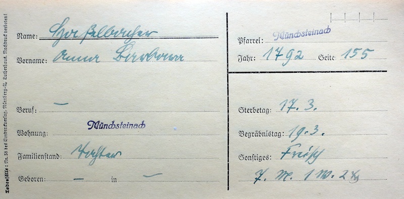 Thus, the record just below is for Anna Barbara Hasselbacher of Münchsteinach who was someone's Tochter (daughter). She died in 1792 and her record is on page 155. The day of death is the 17th of March and she was buried on the 19th. (Causes of death even for me as a physician are virtually impenetrable at present.) Anna Barbara was one week and 2 days old. You can see her birth record on another page.