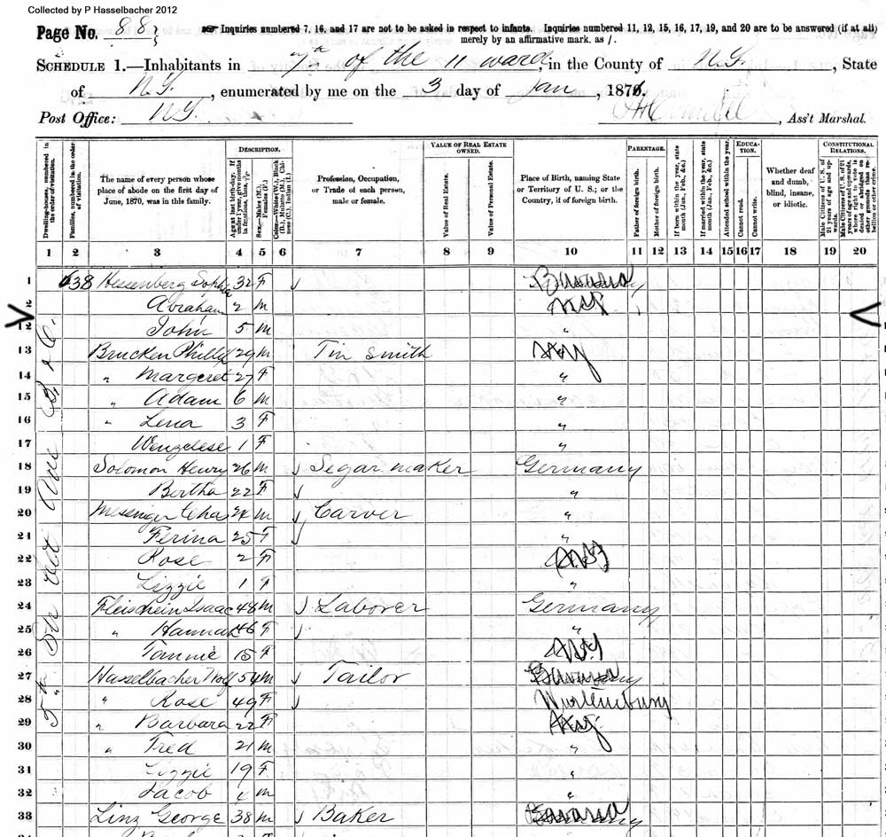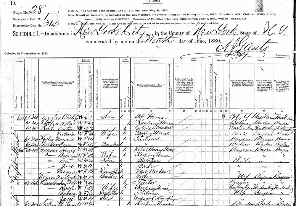 I also found Wolfgang in the New York City St. directory living at several addresses and always as a tailor. Interestingly, in 1880's name was given as Peter Hasselbacher living at the same address as Wolfgang in the 1880 census. The street directory entries I know about are listed below.