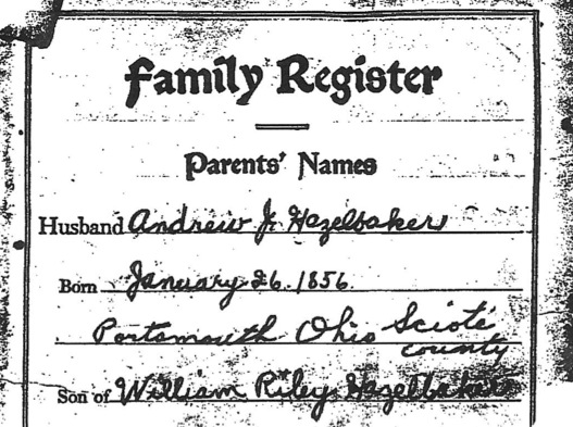 Andrew Jackson Hazelbaker, and Flora Frances Baker of Portsmouth, OH.
