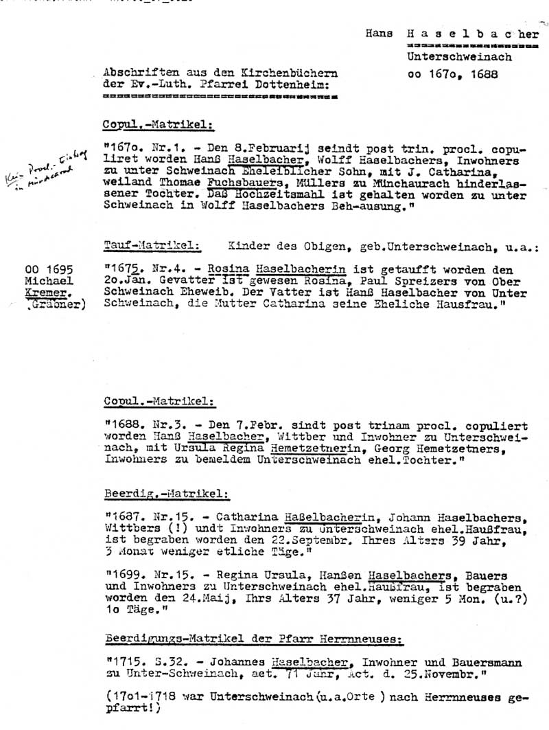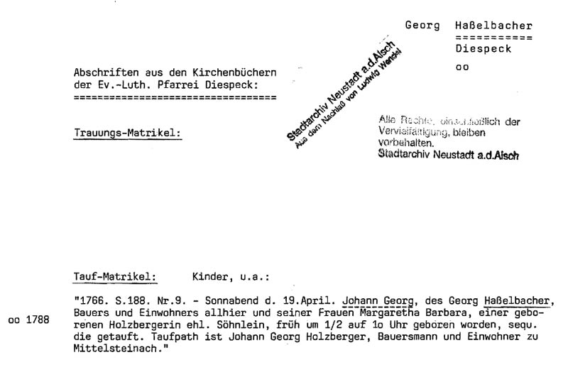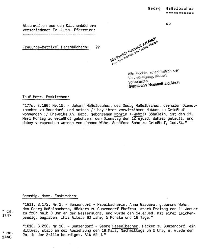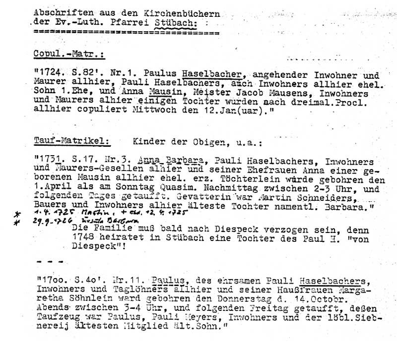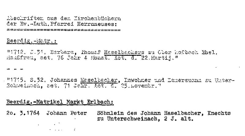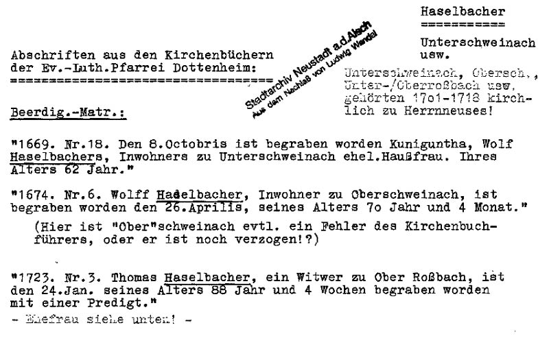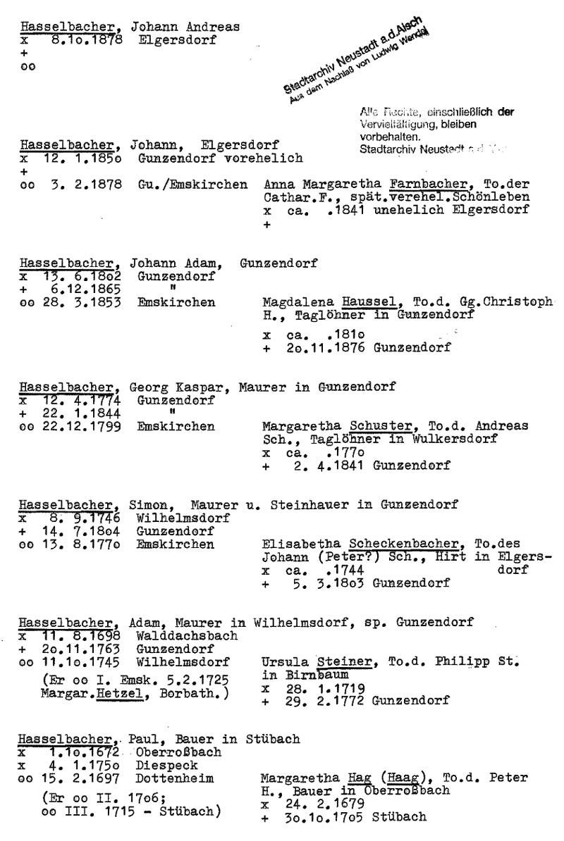 The first pages were collected at a visit to the GFF in Nürnberg: I was not fully aware of their sources. I found even more in the city archives of Neustadt an der Aisch. Some came from the efforts of Herr Ludwig Wendel who had privileged access to the actual church books across the region, and from Herr Martin who may have had similar access. The material from Gresten appears to have been transcribed by Herr Schöberl of Gresten. Some of the material has the fingerprints of my relative, Fritz Hasselbacher, who visited Gresten many years ago and was one of the few allowed access to the castle and church records. Some comes from the family tree of Pfarrer Georg Kuhr. Some is still of unknown origin to me. I want very much to give proper attribution, and will do so as swiftly as I can identify the sources. Needless to say, these records represent the work of truly expert German family historians, some of whom may be actual relatives! Whatever the respective sources, these are the definitive records of the early Hasselbacher family of Germany. They represent transcriptions into modern German of the difficult (if not impossible) to read church records of up to 400 years ago.