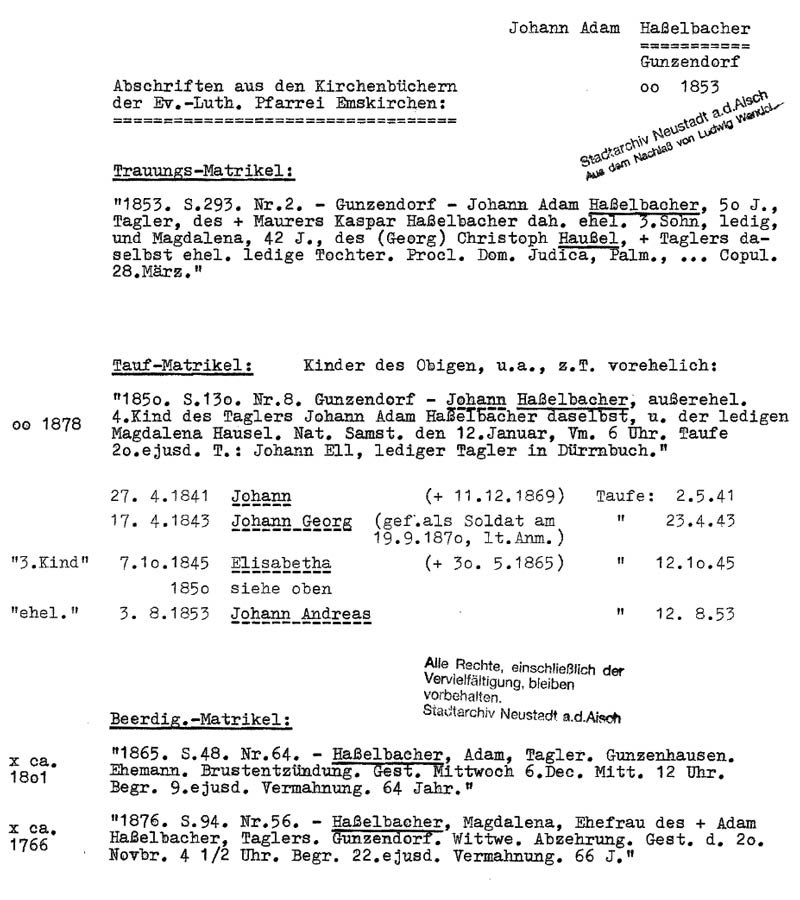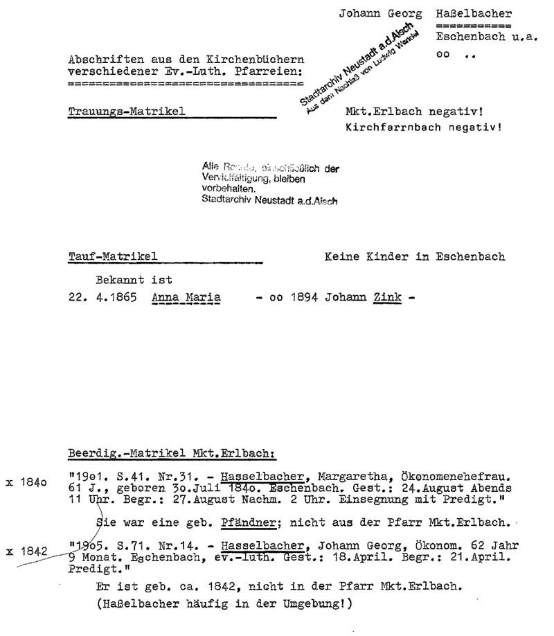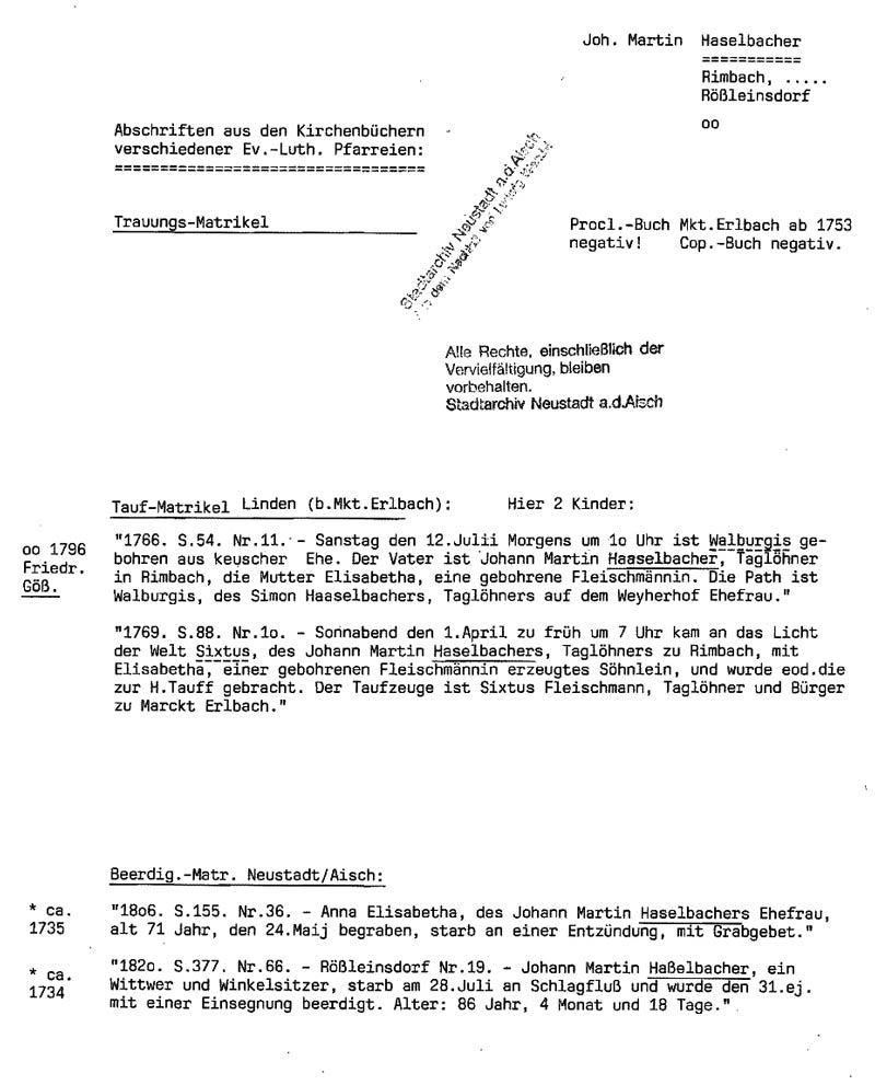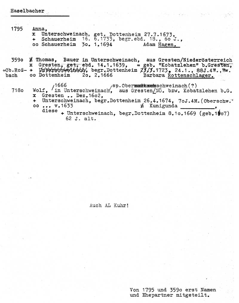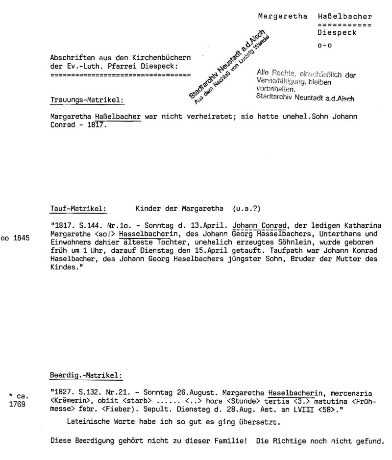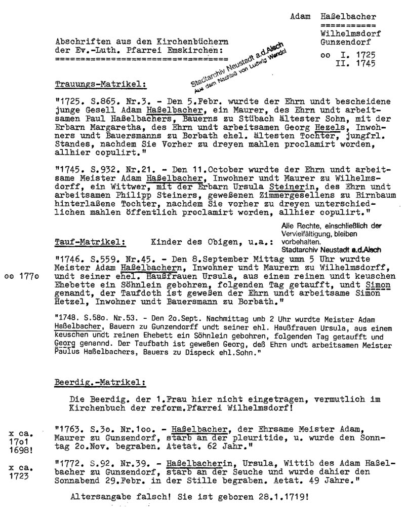 The first pages were collected at a visit to the GFF in Nürnberg: I was not fully aware of their sources. I found even more in the city archives of Neustadt an der Aisch. Some came from the efforts of Herr Ludwig Wendel who had privileged access to the actual church books across the region, and from Herr Martin who may have had similar access. The material from Gresten appears to have been transcribed by Herr Schöberl of Gresten. Some of the material has the fingerprints of my relative, Fritz Hasselbacher, who visited Gresten many years ago and was one of the few allowed access to the castle and church records. Some comes from the family tree of Pfarrer Georg Kuhr. Some is still of unknown origin to me. I want very much to give proper attribution, and will do so as swiftly as I can identify the sources. Needless to say, these records represent the work of truly expert German family historians, some of whom may be actual relatives! Whatever the respective sources, these are the definitive records of the early Hasselbacher family of Germany. They represent transcriptions into modern German of the difficult (if not impossible) to read church records of up to 400 years ago.