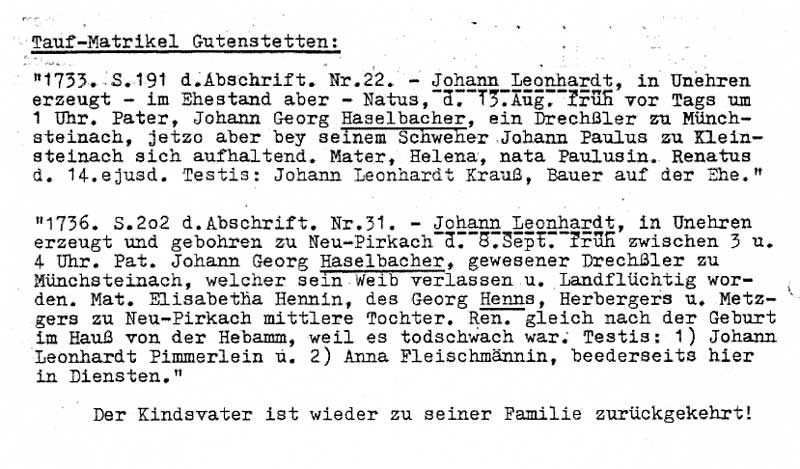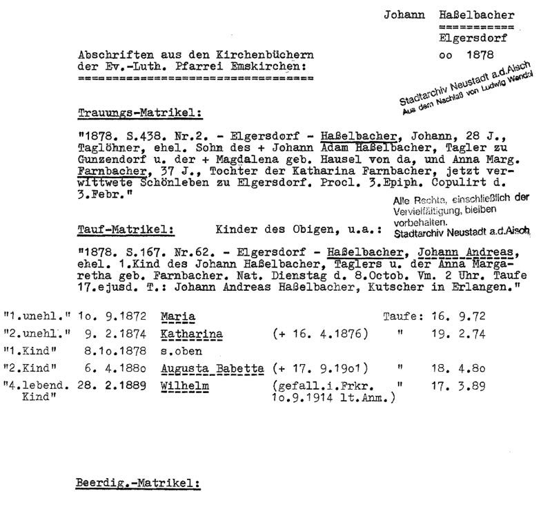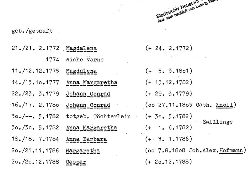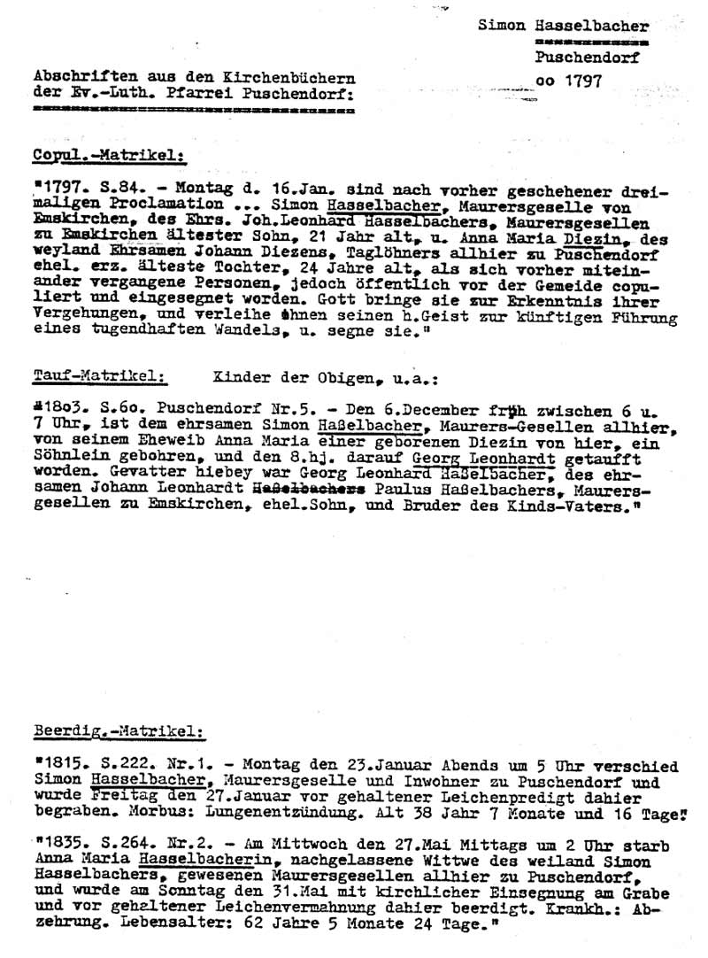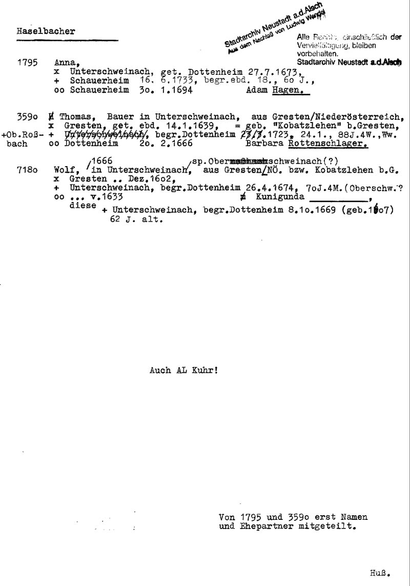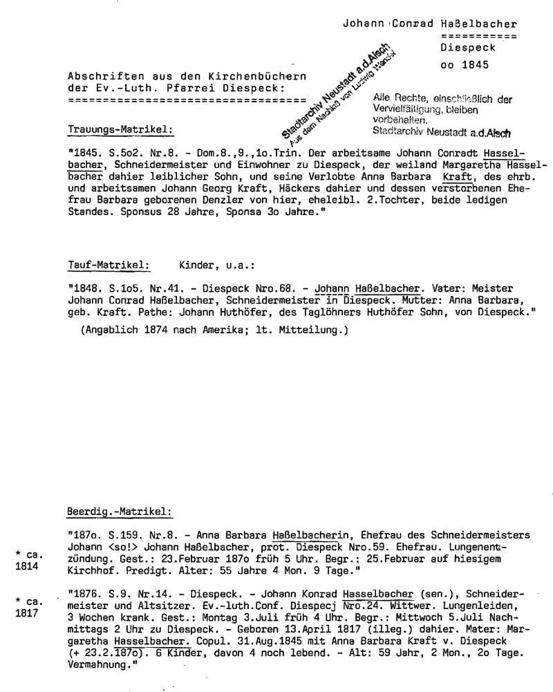 The first pages were collected at a visit to the GFF in Nürnberg: I was not fully aware of their sources. I found even more in the city archives of Neustadt an der Aisch. Some came from the efforts of Herr Ludwig Wendel who had privileged access to the actual church books across the region, and from Herr Martin who may have had similar access. The material from Gresten appears to have been transcribed by Herr Schöberl of Gresten. Some of the material has the fingerprints of my relative, Fritz Hasselbacher, who visited Gresten many years ago and was one of the few allowed access to the castle and church records. Some comes from the family tree of Pfarrer Georg Kuhr. Some is still of unknown origin to me. I want very much to give proper attribution, and will do so as swiftly as I can identify the sources. Needless to say, these records represent the work of truly expert German family historians, some of whom may be actual relatives! Whatever the respective sources, these are the definitive records of the early Hasselbacher family of Germany. They represent transcriptions into modern German of the difficult (if not impossible) to read church records of up to 400 years ago.