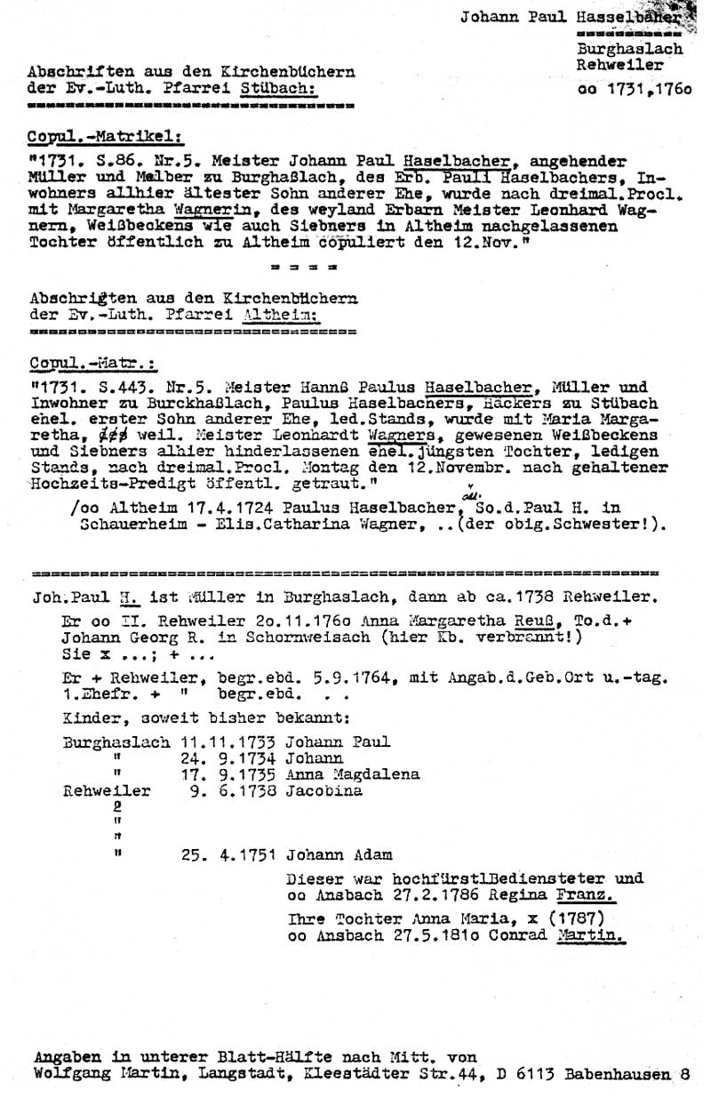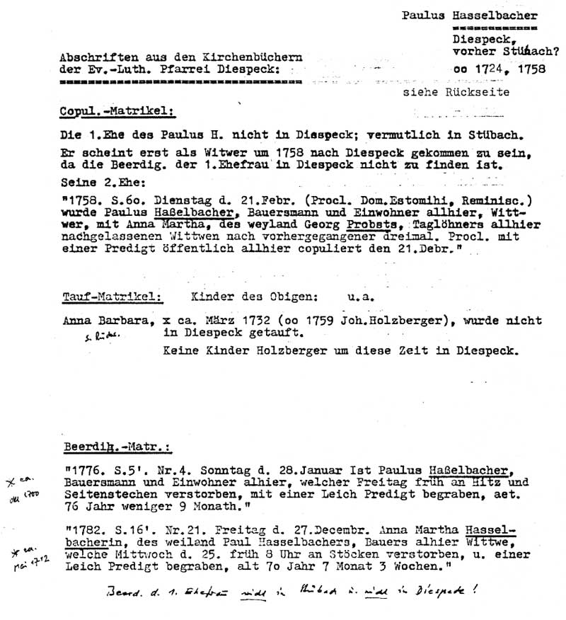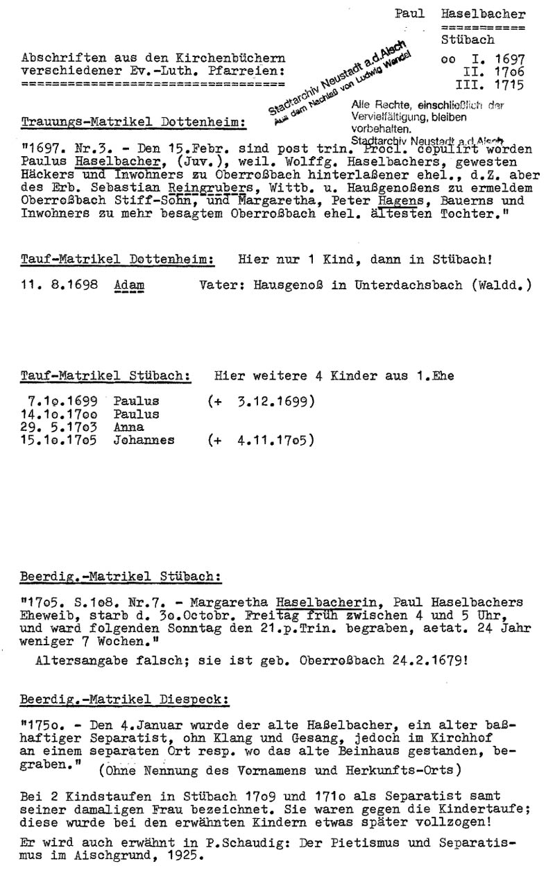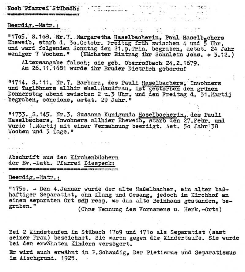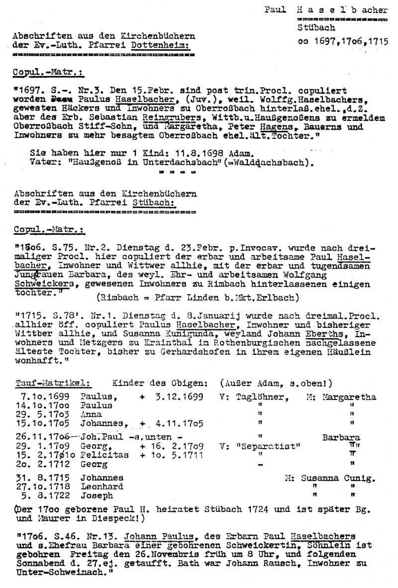 | Paul Hasselbacher | 1672 | Oberroßbach | 1750 | Stübach/ Diespeck | Son of Wolff and Agatha page 2 |