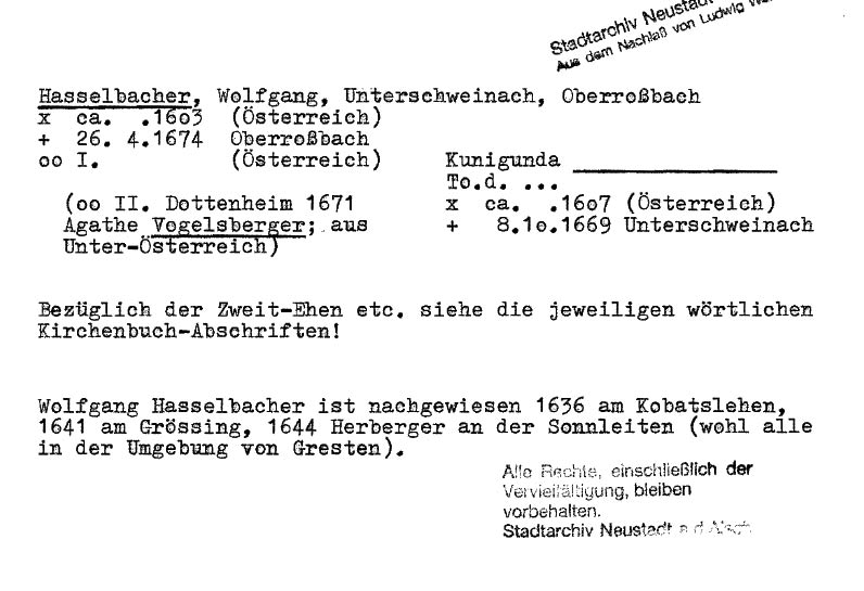 | Wolfg. Hasselbacher | 1603 | Gresten | 1674 | Oberroßbach | Ancestor of most known modern Hasselbachers. |