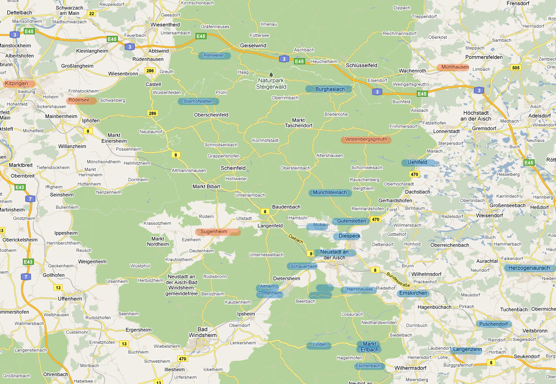 The map below has the Jewish communities associates with Hermann Schloss and his wife Sophie Hasselbacher Saemann highlighted in orange. Locations in which lived other Hasselbachers known to me are highlighted in blue. A Jewish Family Hasselbacher arose in Vestenbergsgreuth.