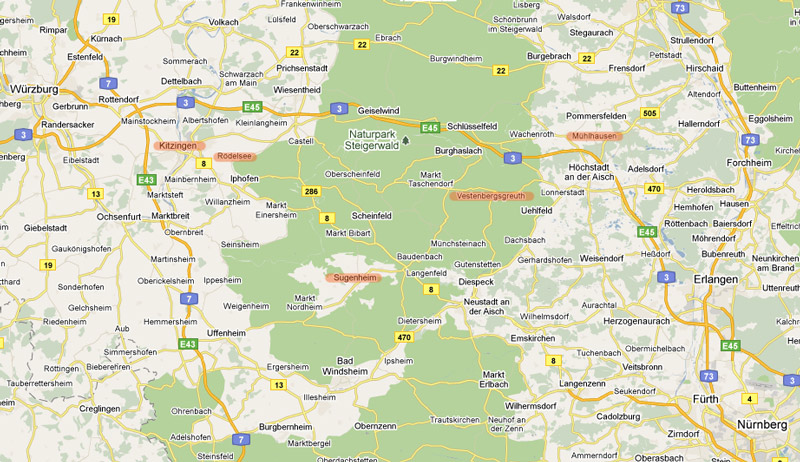 What can we make of this? Presumably this information came from synagogue records. There were small Jewish communities and cemeteries in both Sugenheim and Rödelsee associated with the larger community in Kitzingen. A quick internet search reveals that there was also a small Jewish community in Vestenbergsgreuth and in nearby Mühlhausen. In the map below, the communities associated with this family are highlighted in orange.