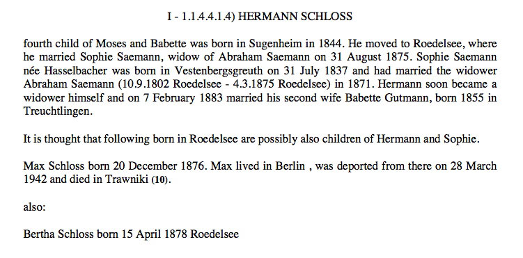 Sophie Hasselbacher was born 31 July 1837 in Vestenbergsgreuth, Franken. She married Abraham Saemann of Rödelsee in 1871 at the age of 34. Abraham died four years later in 1875. Sophie remarried Herman Schloss in that same year at the age of 38. It appears she had two children with Herman in Rödellsee: Max, and Bertha. Sophie died before February 1883 when she would have been 46.
