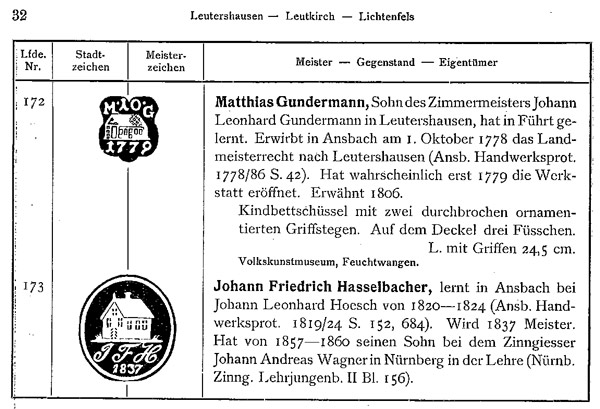 Leutershausen is a village just 12 km to the west of Ansbach. A targeted search for Johann Friedrich returns only links to the Jewish Museum. Because their online image was accompanied by a few additional facts, I wrote the the Museum to see what else they might know. Curator Susan L. Braunstein kindly showed me a page from a "standard" (for them!) catalog of German pewter makers and their marks.