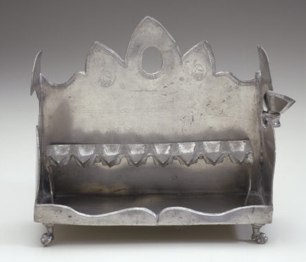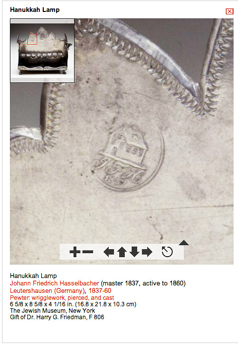 While searching for additional information about a possible Jewish Family Hasselbacher in Vestenbergsgreuth, I found an additional HUO (Hasselbacher of Unknown Origin)! There is a Hanukkah Lamp in the collection of The Jewish Museum of New York City made by the pewter-master Johann Friedrich Hasselbacher of Leutershausen. The two images below are screen-shots from the Museum website.