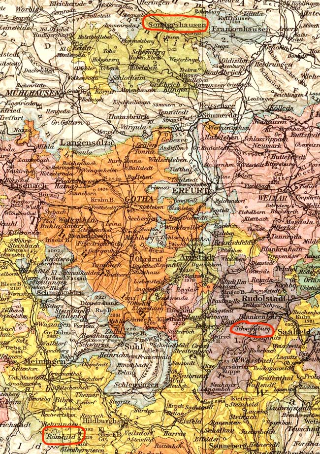 Schwarzburg-Sondershausen comprises two distinct, separate, but nearby geographical areas depected in the greenish hue. A smaller potion containing the city of Armstadt lies just to the south of the larger. They can be seen in this map of uncertain date. The village of Schwarzburg in is actually in the Principality of Schwarzburg-Rudolstadt. What makes this matter even more tantalizing is that the only village named Römhild in Germany today is only a short distance away. The whole area is just a two hour drive from Nürnberg and is begging for a visit!